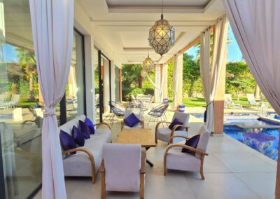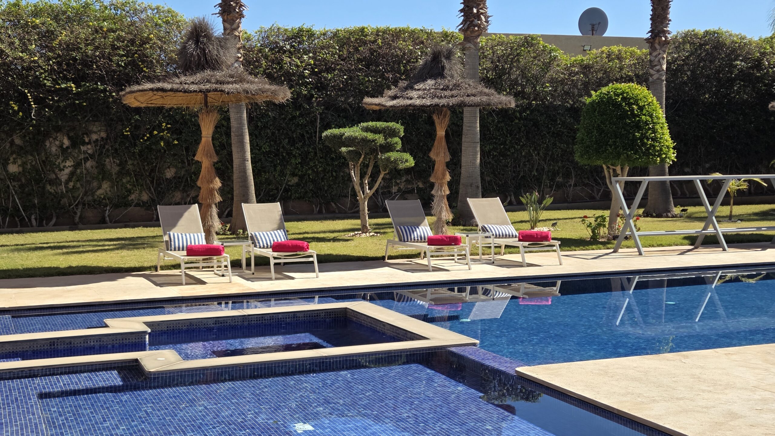 Offrez vous un moment de détente grâce à sa piscine de 17m, son jacuzzi et son bassin enfants attenant. La villa dispose également de son propre hammam.